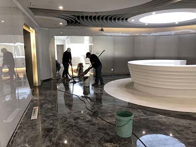 開荒保潔玻璃的標準:目視無水痕、無手印、無污漬、光亮潔凈。 開荒保潔使用本技術可大大提高石材的使用壽命及防水、防油、防污、增亮、加硬的效果。